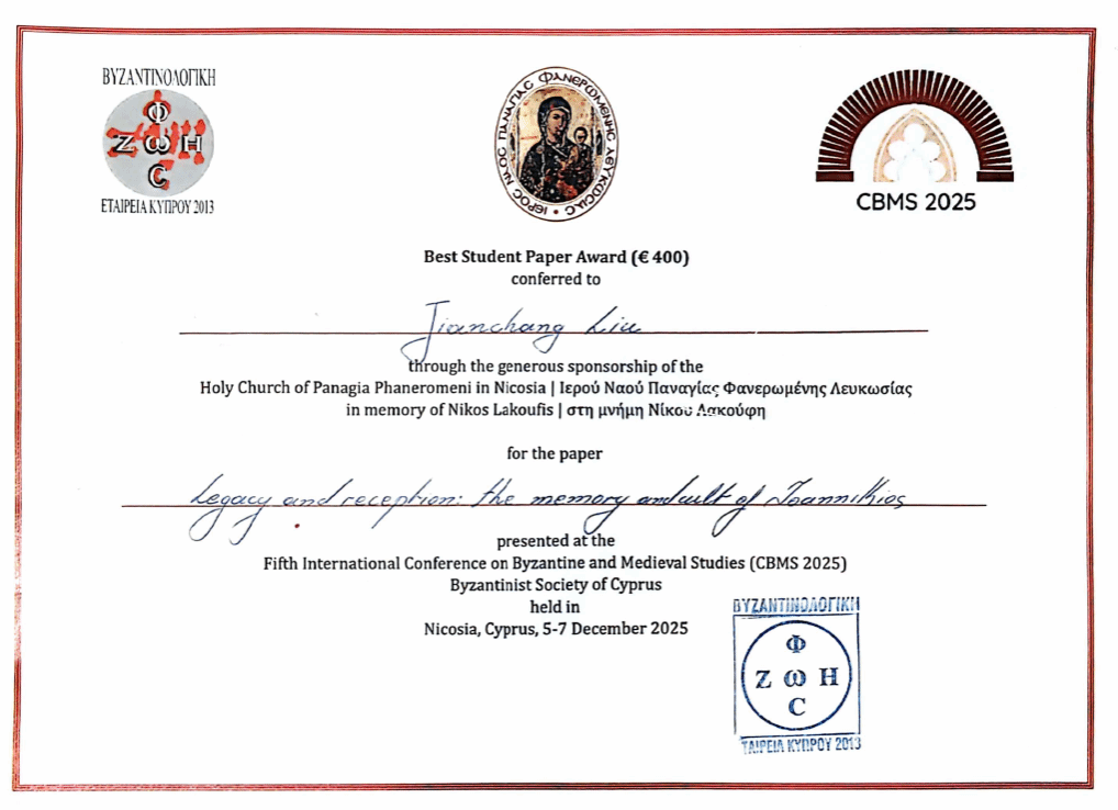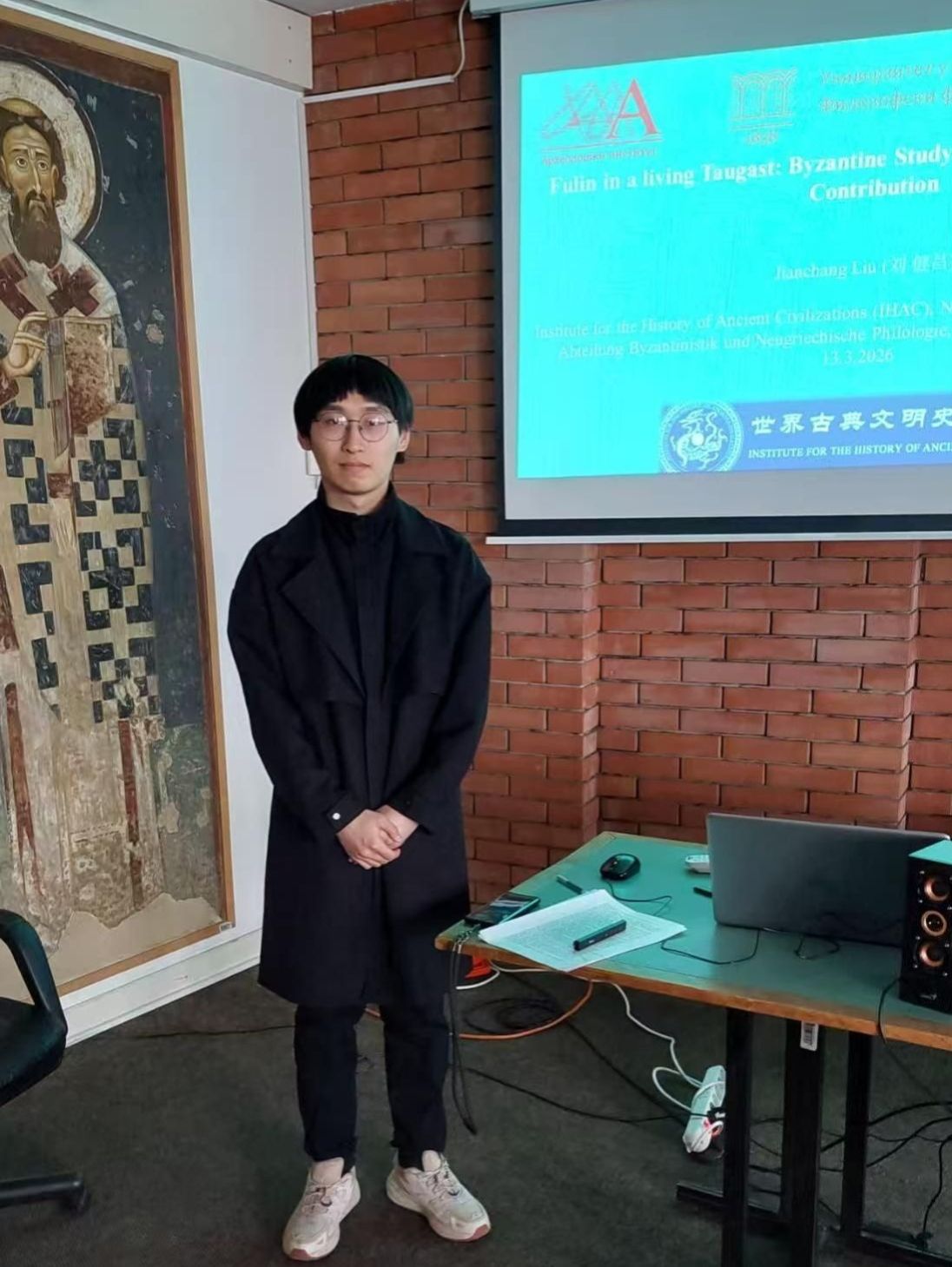 2025 年秋,世界古典文明史研究所2024级硕士研究生刘健昌获得欧盟伊拉斯谟奖学金资助,前往德国科隆大学进行为期一学期的交换学习。留德期间,刘健昌修读该校拜占庭学研究课程,并与该校拜占庭学团队合作建设拜占庭钱币数据库。同时,刘健昌积极参加国际学术交流,作为唯一来自东亚地区的学者在法国巴黎与塞浦路斯尼科西亚举办的两次拜占庭学专业学术会议上独立发表英文论文;提交给尼科西亚会议的论文被塞浦路斯拜占庭协会评为该会议唯一一等奖。2026年3月,他受邀在塞尔维亚贝尔格莱德大学与塞尔维亚考古所进行客座讲座,并对当地罗马-拜占庭遗址进行考古调查。
